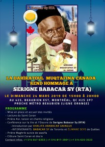 La Dahiratul Muqtafina Bi Âssâril Âbâ-i Wal Adjdâd (les jeunes qui cheminent sur les traces des anciens) du Canada rappelle tous les membres et sympathisants qu'elle compte rendre Hommage à SERIGNE BABACAR SY (RTA)